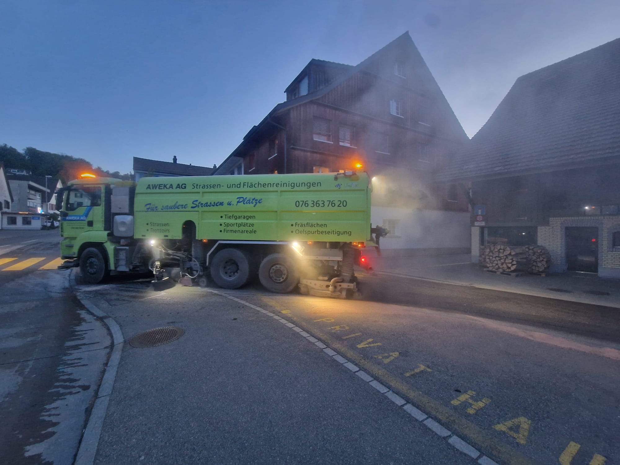 Die am stärksten verschmutzen Stellen haben wir anschliessend mit Ölbinder abgestreut um die Gefahr durch ausrutschen zu minimieren. Gleichzeitig boten wir einen Flächenreiniger auf, um die Strasse vollständig zu reinigen.